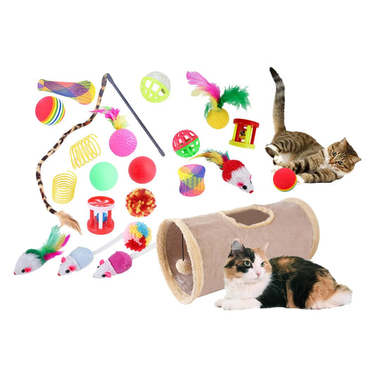 25-Piece Cat Toys Kit with Rainbow Tunnel - Interactive Cat Toy Bundle for Indoor Cats, Kitten Playtime Variety Set Includes Feather Teaser, Springs, Balls, Mice & Noise Toys